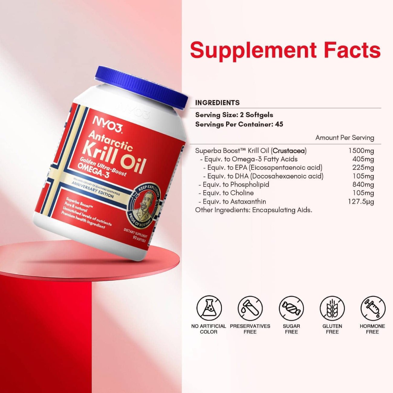 NYO3® Golden Ultra-boost Antarctic Krill Oil softgel is made with Superba boostTM krill oil, a premium health ingredient designed to deliver tailored health benefits. lt is pure, natural, more effective, with unmatched levels of nutrients. Superba Boost™ krill oil Omega-3 fatty acids are considered to be more bioavailable,as they are bound to naturally occurring phospholipids, thus allowing for better absorption.