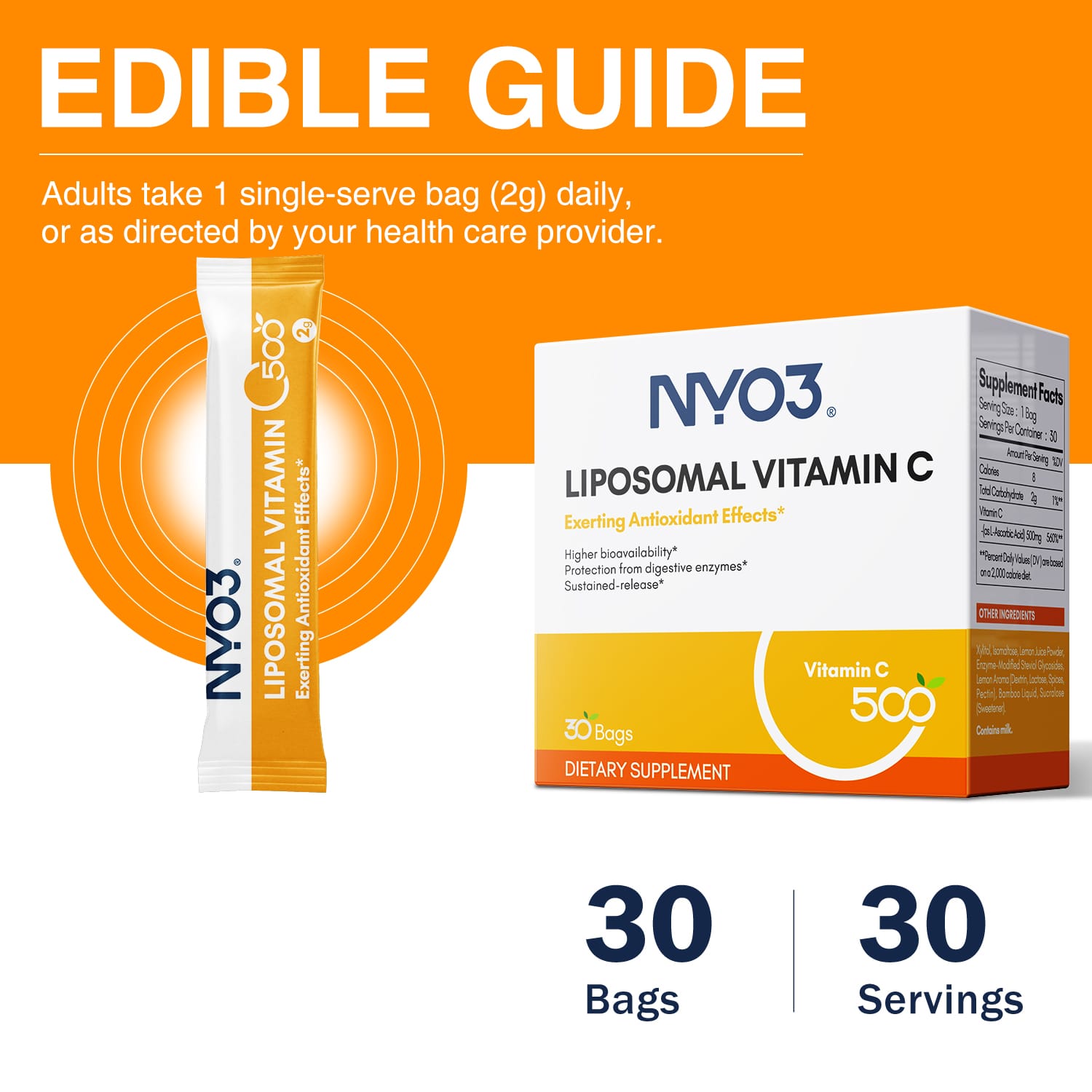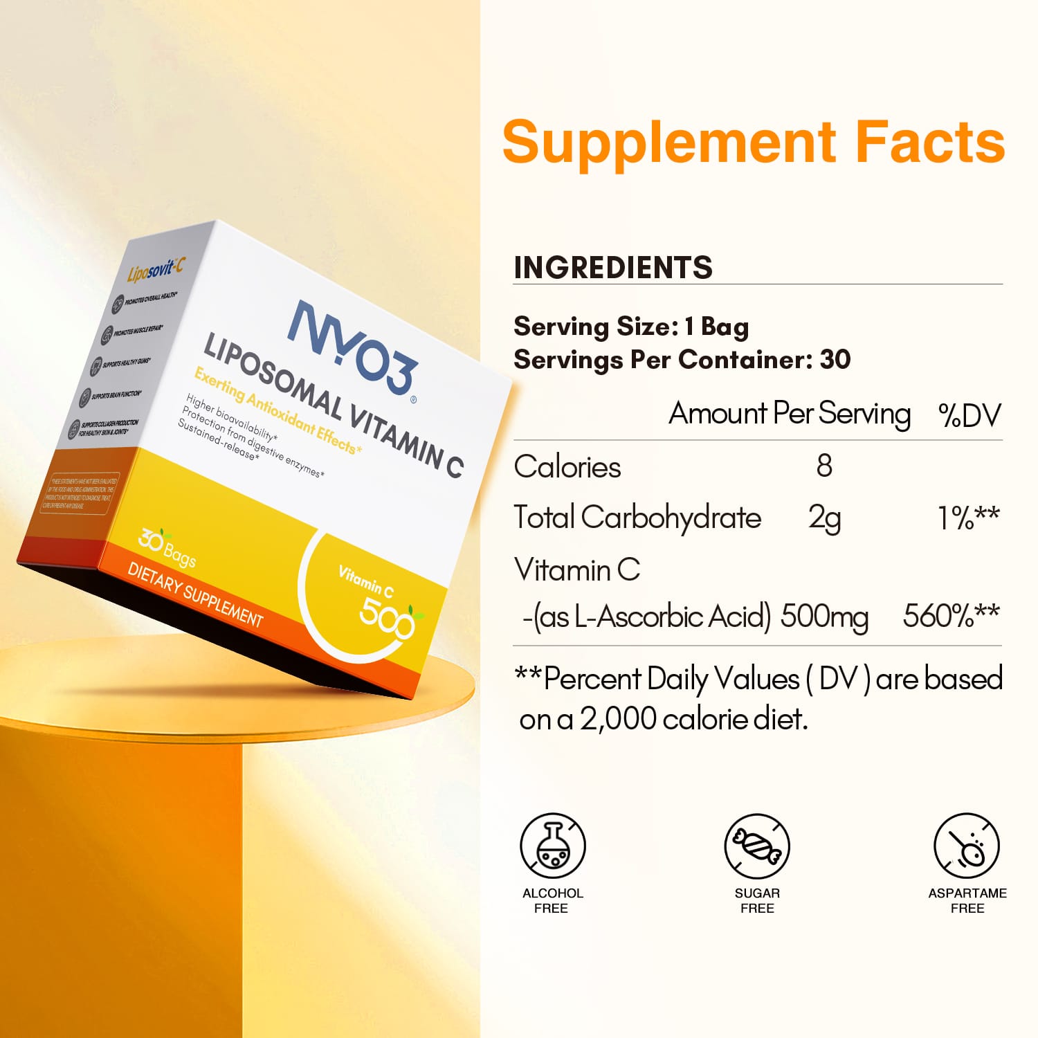NYO3 liposomal technology encapsulates Vitamin C in lipid (fat) molecules, significantly improving its absorption and bioavailability compared to regular Vitamin C supplements. This means more of the nutrient reaches your cells, a longer sustained release time, protecting it from degradation in your digestive system.