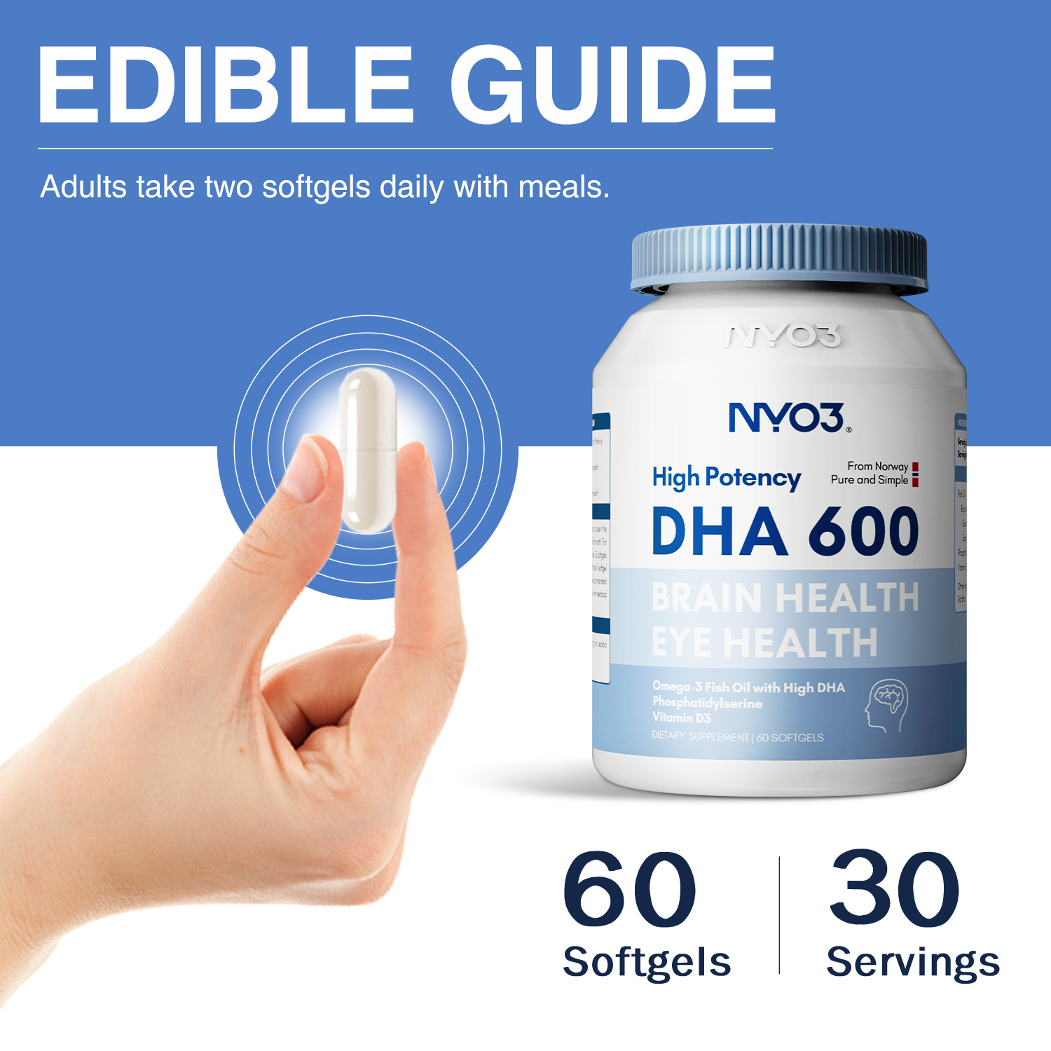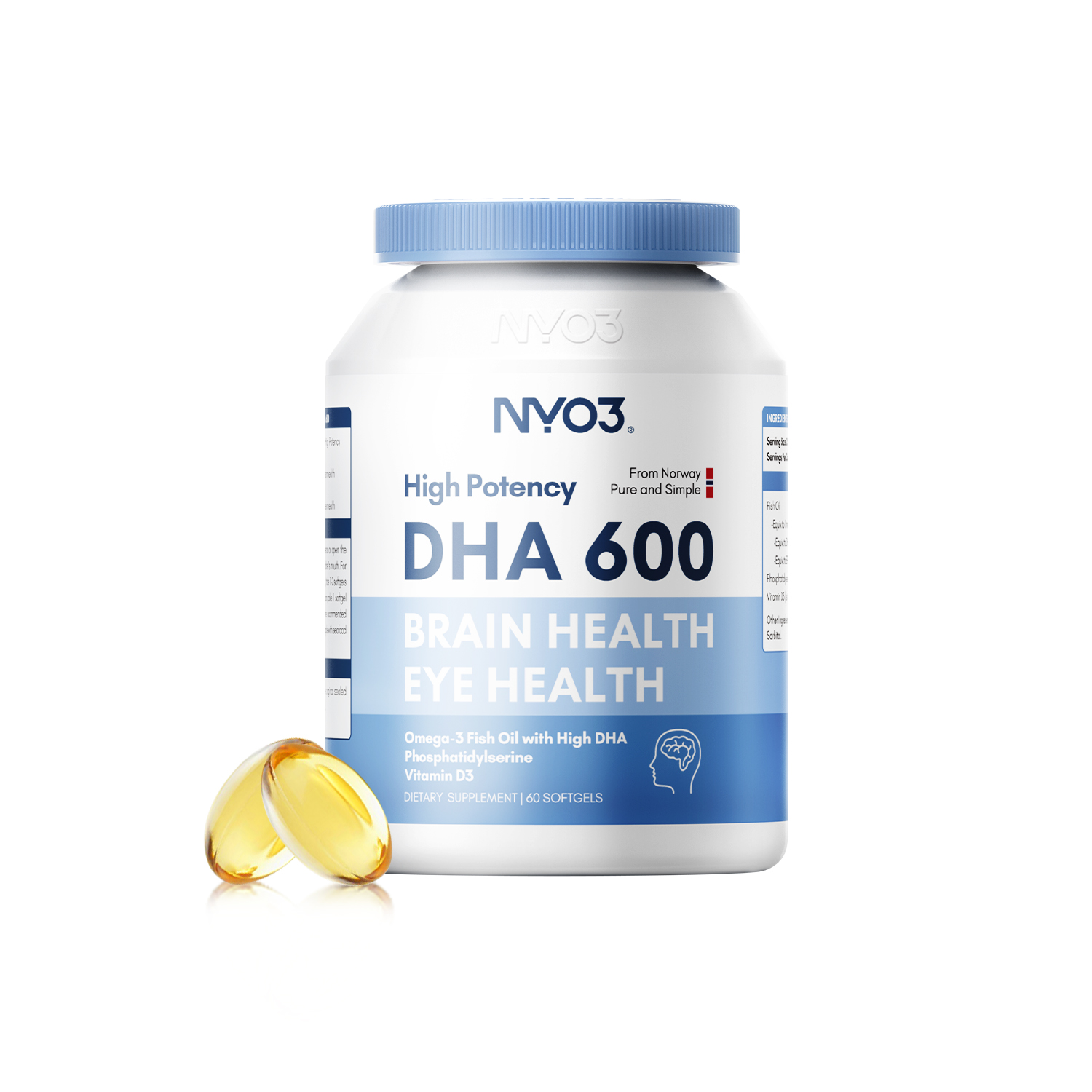 NYO3® High Potency DHA 600 Fish Oil is one of the high-potency fish oil supplements that contain 1000mg of high-quality fish oil per serving, providing a potent source of essential omega-3 fatty acids, including EPA and DHA.